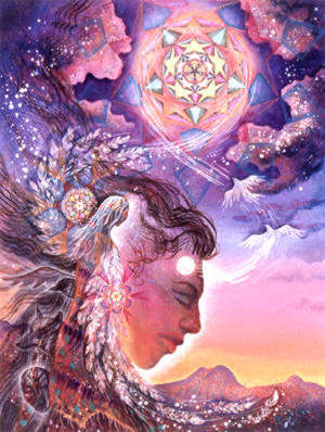 Deep in meditation this woman's consciousness is transported to higher realms. Here she contemplates the underlying geometric structure that precedes physical manifestation. In this state her animal guides and ancestors may visit, and her ministering angels whisper in her ear. She knows she is never alone. |