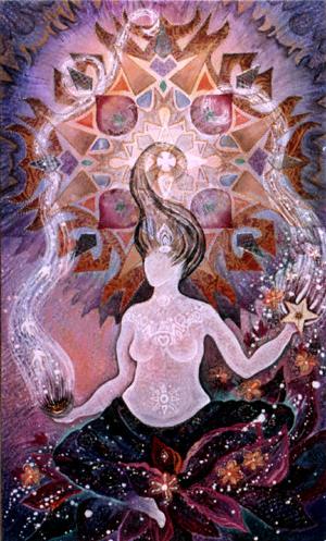 A woman sits deep in meditation upon her lotus cushion. The solidity of the world around her begins to dissolve, and she becomes more aware of pulsating waves of energy. From her crown chakra she perceives energy streaming forth in geometric patterns from the eye of God. All of her chakras align and open like the lotus itself. Creative energy in the form of the sun and moon streams forth from her hands. |