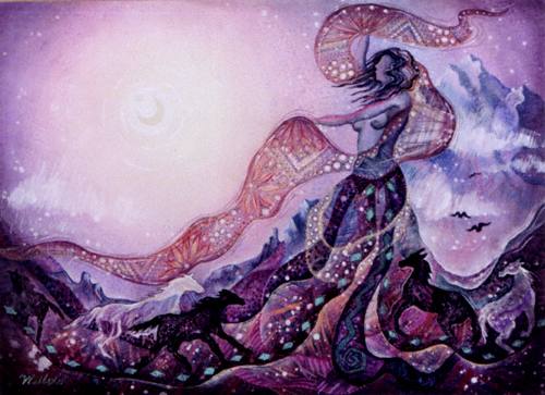 A woman is dancing in the wind with her veil. It lifts the cloth and swirls it around her. She dips it toward the ground, creating imaginary spirals in the sky. Spirit horses play around her, feeling the flow and passion of the wind. She is alive, and has access to all her life force energy. |