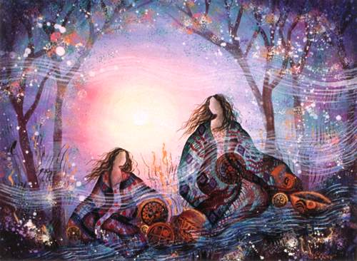 A mother and daughter go down to the river to wash the pots after the evening meal. Although they have done this simple domestic task countless times, they continue to do it with reverence. Their hearts are filled with gratitude for the earth which nourishes their bodies, and appreciation for the river in which they bathe and wash their pots. These women bring mindfulness of all that is sacred to the simple tasks of life. |